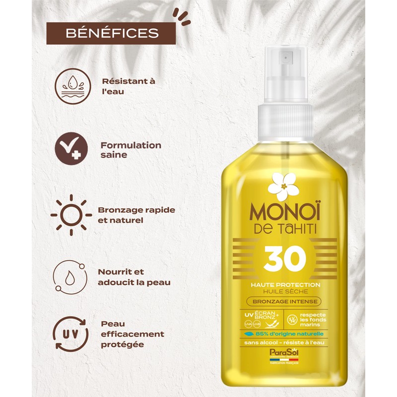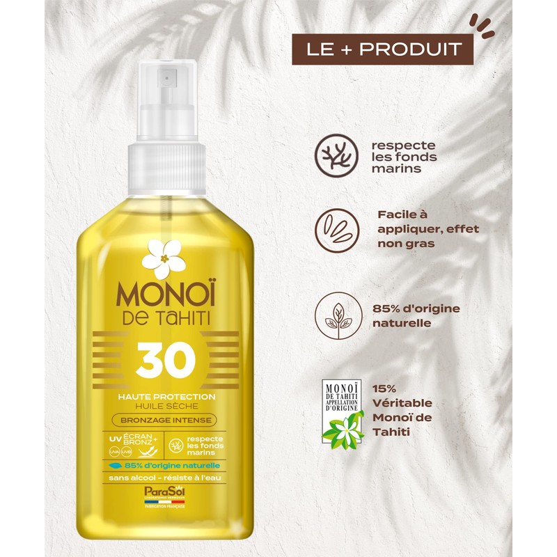 - Original Tahiti-Monoï name intensive tan moisturises, protects and satin finish the skin. No parabens, no alcohol, waterproof.