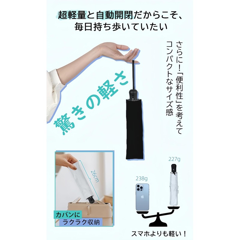 - Ultra Lightweight 8.9 oz (227 g), Easy to Carry: Even though it is an automatic folding parasol, it uses glass fiber and aviation aluminum alloy ribs, it has a weight of 8.0 oz (227 g). Lightweight like a smartphone, easy to carry. Comfortable for both kids and adults. Suitable for commuting to work or school, traveling, business trips, etc