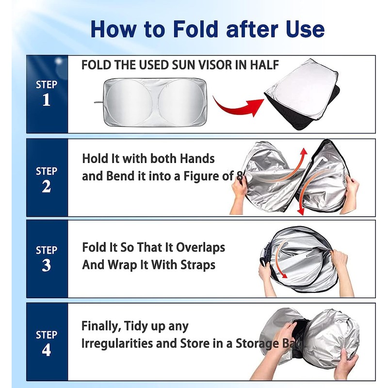 - 🚗【Fácil de Usar】Simplemente abra el parasol, póngalo en el cristal de la ventana delantera del coche, y fíjelo con el parasol, puede instalarse y plegarse en segundos sin ventosas ni adhesivos. El parasol del coche tiene una bolsa de almacenamiento, que es de tamaño pequeño y conveniente para el uso diario. Se puede guardar fácilmente en el bolsillo de la puerta del coche sin ocupar espacio.