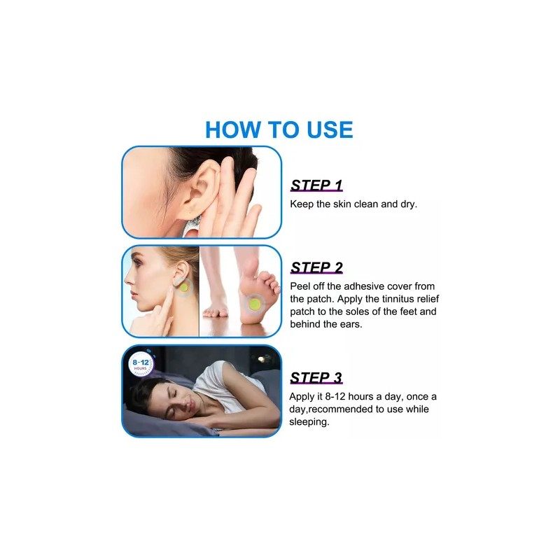 Cada parche es una pequeña cápsula de alivio, fácil de usar y discretamente poderoso. Simplemente adhiérelo a la planta de tu pie o detrás de tu oreja (¡donde tu piel lo reciba con los brazos abiertos!) y deja que la naturaleza haga su magia. 🕰️ Entre 8 y 12 horas, sus ingredientes activos se liberan gradualmente, trabajando armoniosamente para silenciar el tinnitus y envolverte en una sensación de calma renovadora. 😴 Y no te preocupes, su fórmula suave está pensada para cuidar tu piel mientras te brinda el alivio que tanto necesitas. ¡Es como un abrazo silencioso para tus oídos!