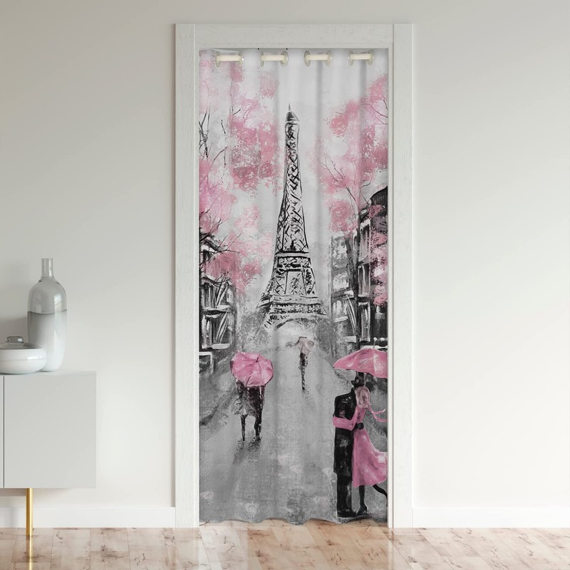 Paris Door Curtain, French Eiffel Tower Blackout, Paris Themed Cherry Blossoms Doorway, Couple Retro Gray Building Pink Grey Closet for Living Room, 1 Panel, 52"W X 80"L