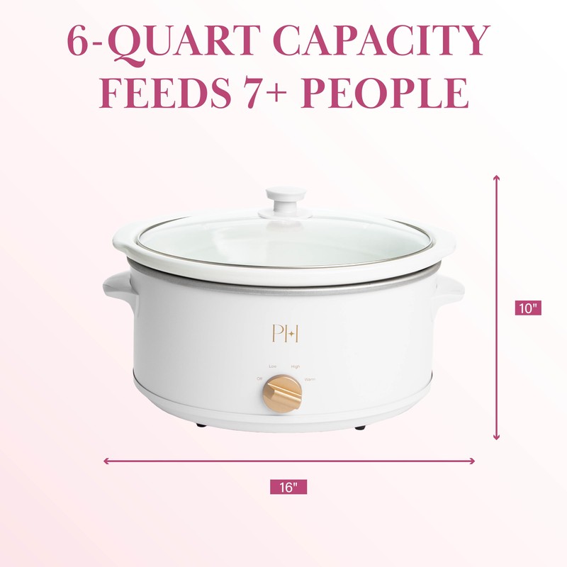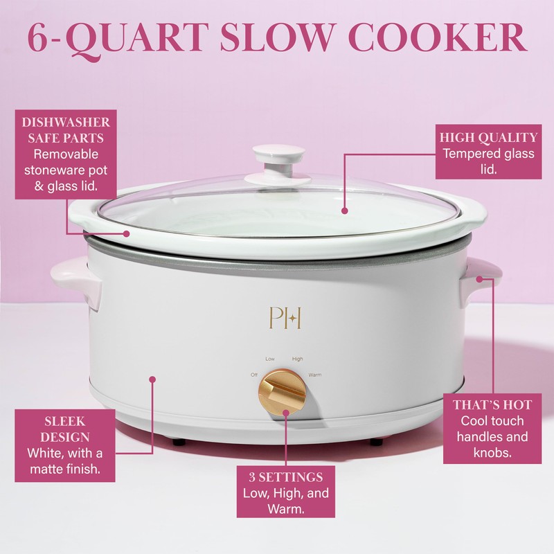 Paris Hilton 6-Quart Manual Slow Cooker, Features Three Settings (Low, High, Warm), Naturally Nonstick and Dishwasher Safe Stoneware Insert, Family Sized Capacity, White