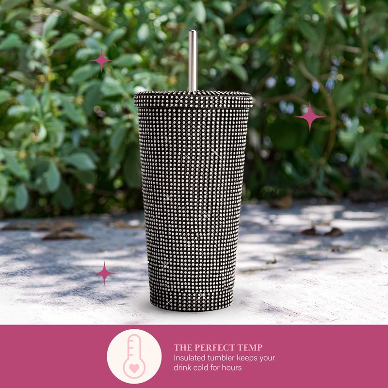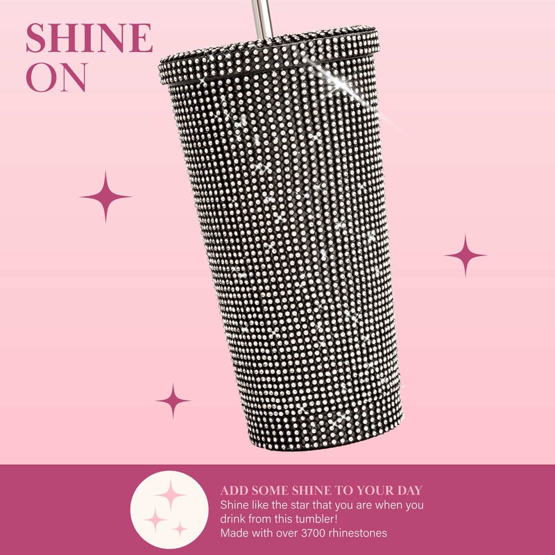 - SHINE ON: Add sparkle to your day and sip like rhinestone royalty with this 16.9-Oz double wall, insulated tumbler. Bedazzled with over 3700 rhinestones and comes with a screw-on lid and reusable stainless steel straw so you can sip and sliv. Available in 4 colors: silver, blue, black and pink.