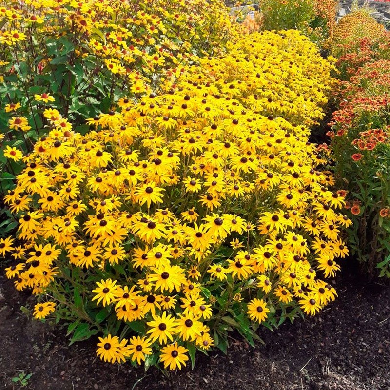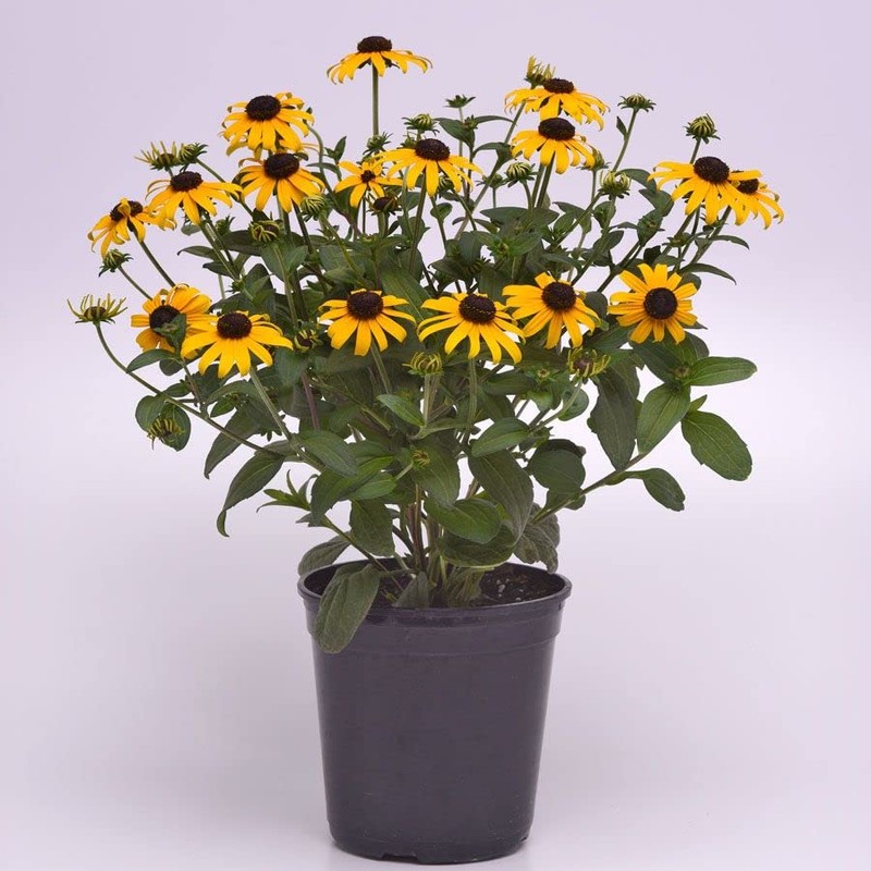 - A Rudbeckia fulgida var. sullivantii, commonly called black-eyed Susan or Sullivant's coneflower, Goldblitz Rudbeckia is an herbaceous plant with an upright, compact, clumping habit of dark green leaves and a fast growth rate. Black-eyed Susan is a classic cottage garden bed and border plant and popular container plant. Rhizomatous, it slowly spreads, forming colonies, and the flowers may self-seed, so consider planting in naturalized areas or removing flowers before they go to seed