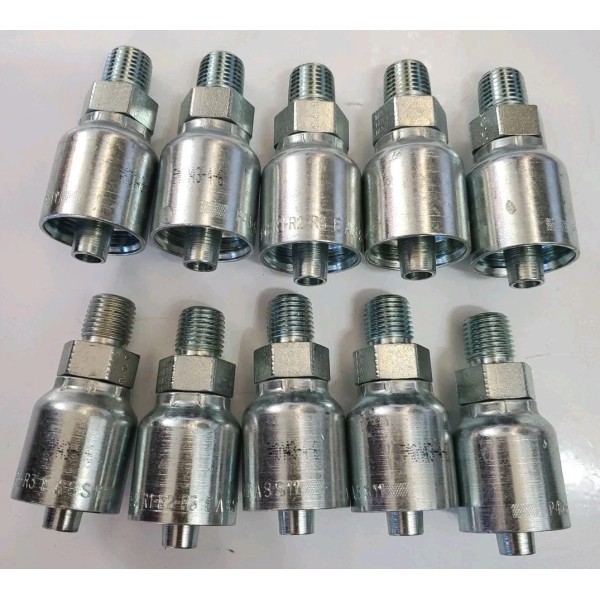 The product is a pack of 10 Parker 10143-4-6 fittings from the Parker 43 Series, designed for specific applications. Each fitting features a 1/4" NPT male thread intended for connection to a 3/8" hose. These fittings are likely suitable for use in hydraulic, pneumatic, pump, or plumbing systems where secure connections between components are required. The Parker brand is known for high-quality fittings, suggesting that these components are reliable and well-suited for their intended purpose.