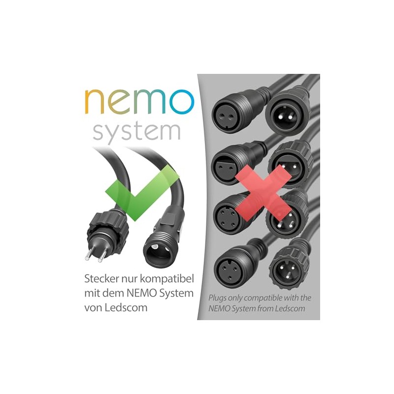 • The one metre long 3-way connector is the suitable connection cable for our LED lights with IP44 connector system NEMO. With the connector, our LED lighting systems can be individually arranged and connected. The connecting element is waterproof and therefore optimally protected for outdoor use. Our tip: order the 3-way connector in a set with LED lights. This is already included in different sets as a connecting element.