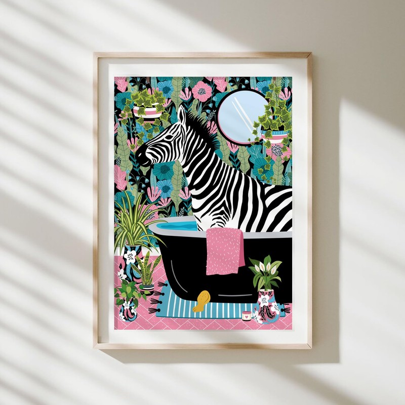 Parmaro Zebra in Bathroom Print, Zebra in Bath Print, A4 UNFRAMED Print, Animal on Toilet Print, Pink Botanical Print, Tropical Bathroom Decor