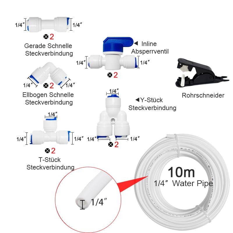 - Reliable and durable: High safety and resilience of the quick connections, suitable for drinking water up to 45 °C, neutral in taste. All parts in this kit are built to the highest requirements. 100% safe food grade material, 100% leak-proof, 100% reusable