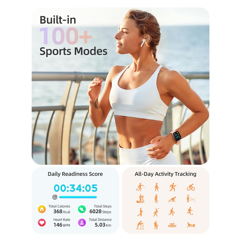 • 【100+ BUILT-IN SPORTS MODES—IP68 WATERPROOF & DUSTPROOF】Elevate your fitness journey with this fitness watch, featuring over 100 built-in sports modes like running, cycling, hiking, yoga, and badminton. Each mode is designed to maximize your performance and help you achieve your fitness goals. Track your steps, distance, calories, and heart rate in real-time to see the impact of your training. With its IP68 waterproof and dustproof design, you can confidently take on any workout, rain or shine, without worrying about splashes or dust. (Note: Not for diving or sauna use.) Choose this reliable sports watch to make every moment of your workout count!