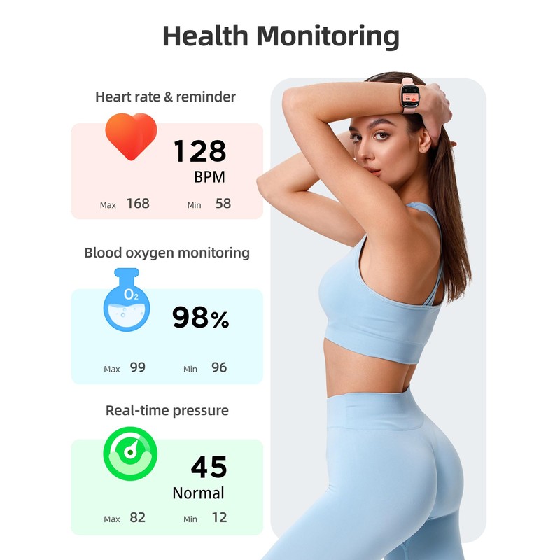 This smartwatch combines style and functionality, suitable for both men and women. With Bluetooth calling capabilities, it allows users to receive or make calls directly from their wrist, providing a clear communication experience. Featuring over 100 sports modes, including running, yoga, and swimming, this smartwatch can track activity data in real-time, such as steps, distance, and calories, while also monitoring heart rate, blood oxygen, and pressure health metrics. Its all-day sleep monitoring, sedentary reminders, and breathing exercises help users pay closer attention to their health. The smartwatch supports smart notifications, automatically displaying alerts from apps like WhatsApp, Facebook, and emails, ensuring users stay informed without needing to check their phones. It also records weight changes, making it easy for users to track their fitness progress, and automatically calculates BMI for a comprehensive view of health status. With over 200 customizable watch faces and a comfortable silicone strap, it showcases unique personality and style. Whether at work, during exercise, or in leisure settings, this smartwatch provides a convenient user experience, supporting a healthy lifestyle.