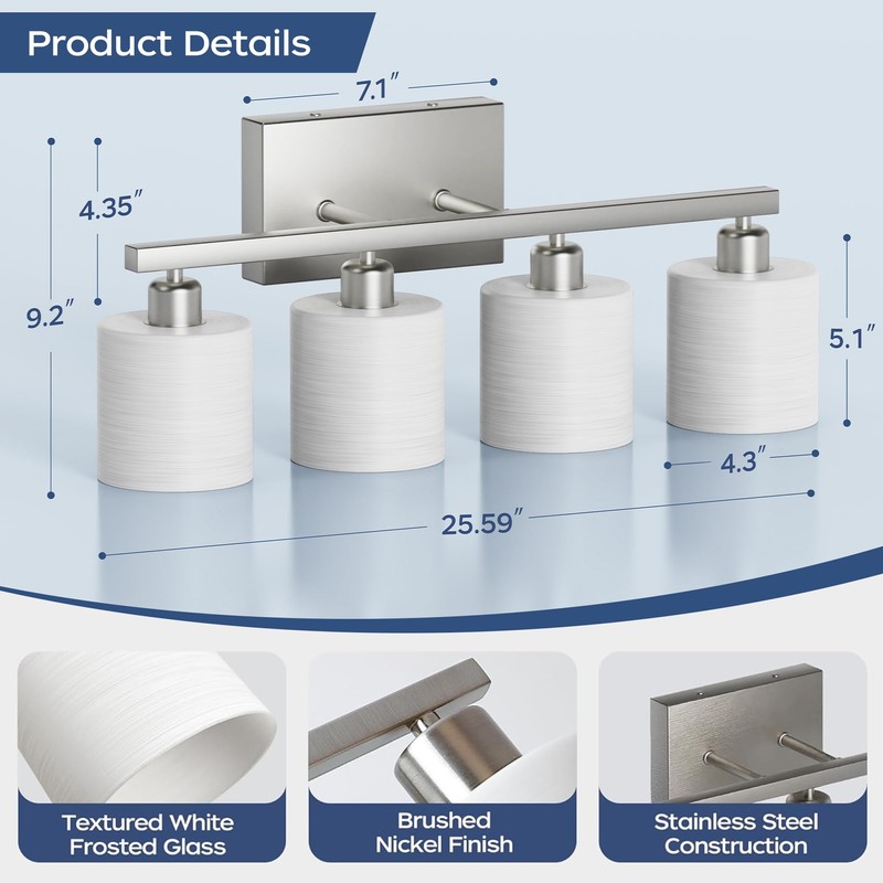 - Modern lighting design: mingle function design with sophisticated style with PARTPHONER bath vanity light. Featuring a stylish brushed nickel finish and textured white cylindrical glass shades, this bath lighting collection adds a pleasing touch of elegance to your home. Ideal for any bathroom in coastal, luxury, modern, and transitional settings