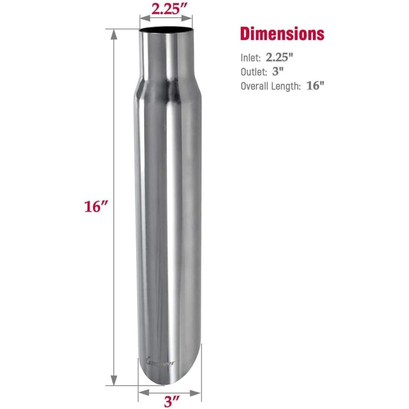 - 【Dimension】2.25 inch inlet diameter; 3 inch outlet diameter; 16 inch overall length.