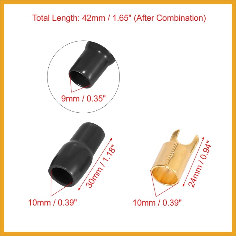 • Beneficial: Dimension: Fit Cable Size: 4 GA; Rubber Boot Length: 30mm / 1.18"; Rubber Boot Diameter: 10mm / 0.39", 9mm / 0.35"; Terminal Length: 24mm / 0.94"; Terminal Outer Diameter: 10mm / 0.39"; Total Length: 42mm / 1.65" (After Combination)