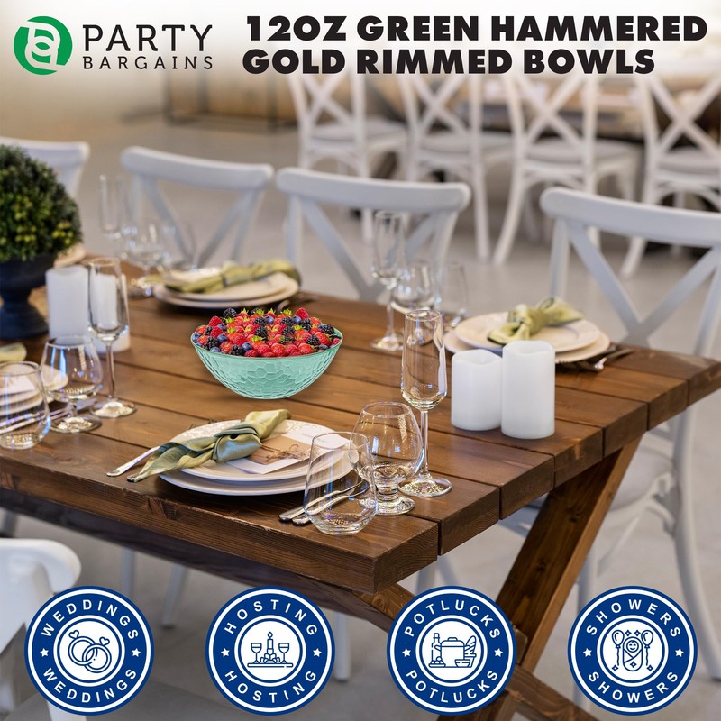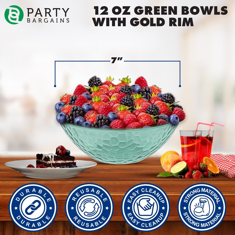 PARTY BARGAINS 12 oz Plastic Bowls, Transparent Green, Gold Rim, 10 Pack