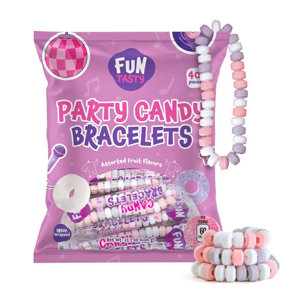 - 21 oz pack with 40 count of Party Candy Bracelets in mixed fruit flavor; wearable strands double as candy jewelry and party favor candy; pink candies in the pastel beads for photo-ready decor