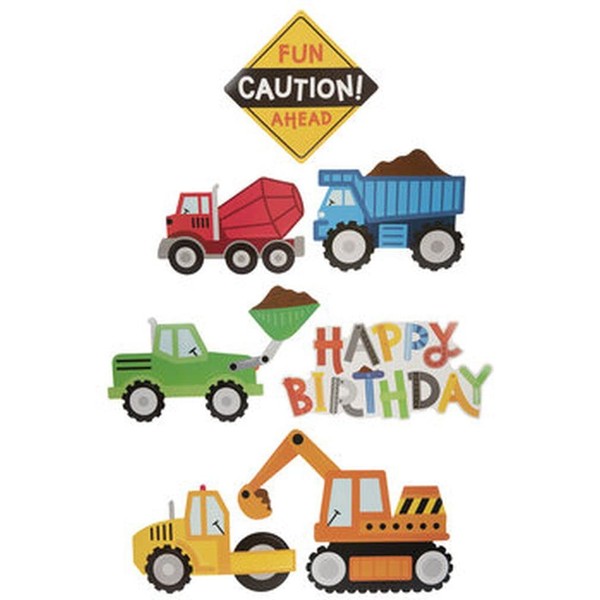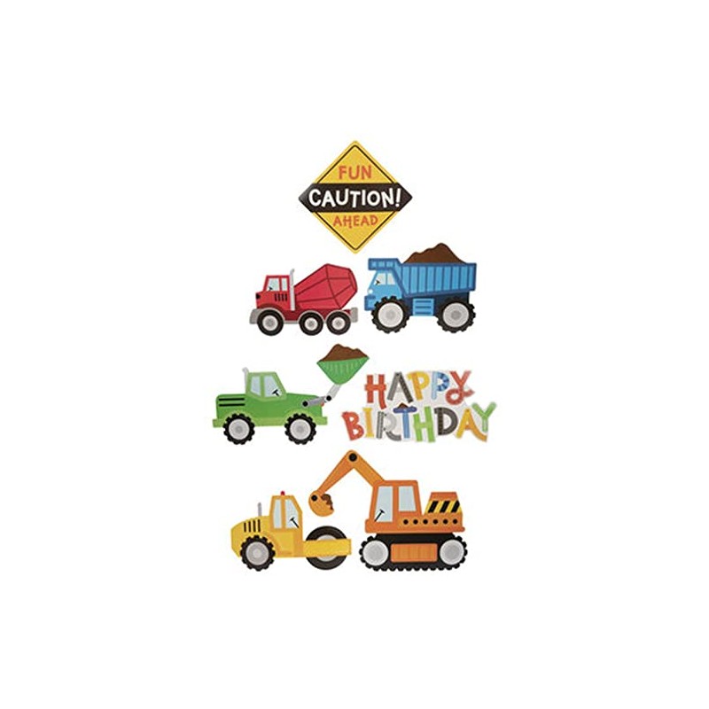 - Designs: construction trucks, a safety sign, and "Happy Birthday" lettering