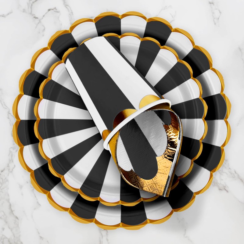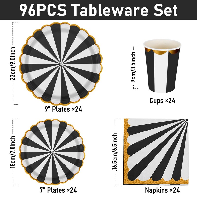 PARTY GO 96-Piece Party Tableware Set, Theme Party Tableware, Party Tableware Set, Black and White Striped Circus Theme Birthday Tableware, Circus Party Accessories (24 Guests