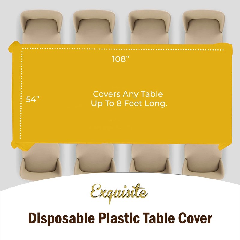 - SIZE: This 54" x 108" Yellow Plastic tablecloth will cover any table up to 8 feet.