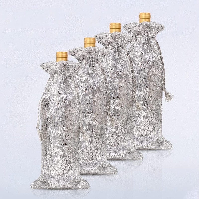PartyDelight Silver Sequin Wine Gift Bag 4 Pack, Sparkly Beautiful and Reusable for Travel, Wedding, Birthday, Housewarming and Dinner Party.