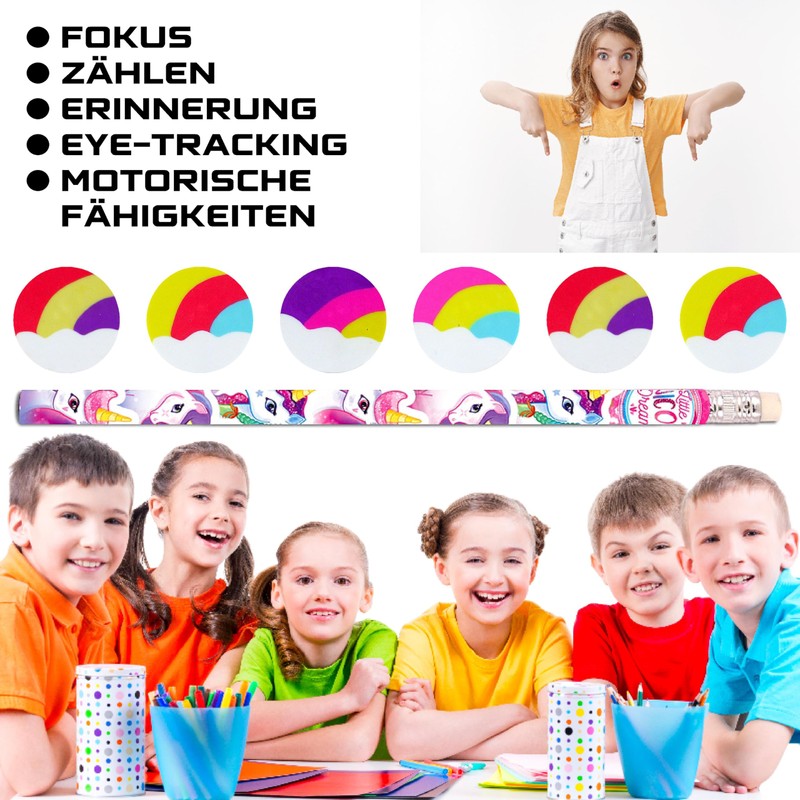 - 16 pieces unicorn stationery set: 8 pencils + 8 erasers.