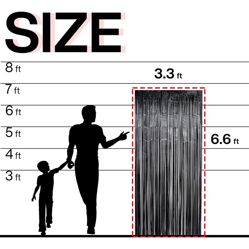 - Incluye: 2 cortinas de flecos de papel de aluminio negro, 6.5 pies de largo x 10 pies de ancho