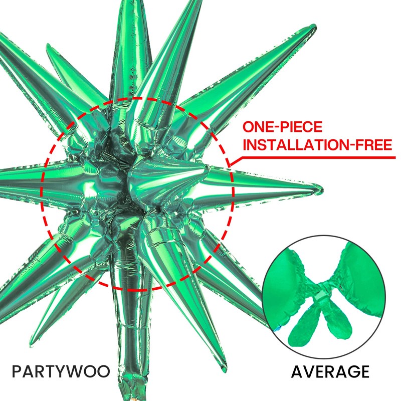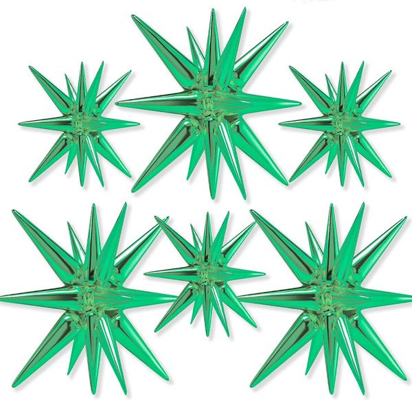 PartyWoo Green Star Balloons 6 pcs, One-Piece 14-Pointed Starburst Balloons, 27 & 22 inch Star Explosion Balloons with Ribbon, Point Star Foil Balloons, Large Mylar Balloons for Party Decorations