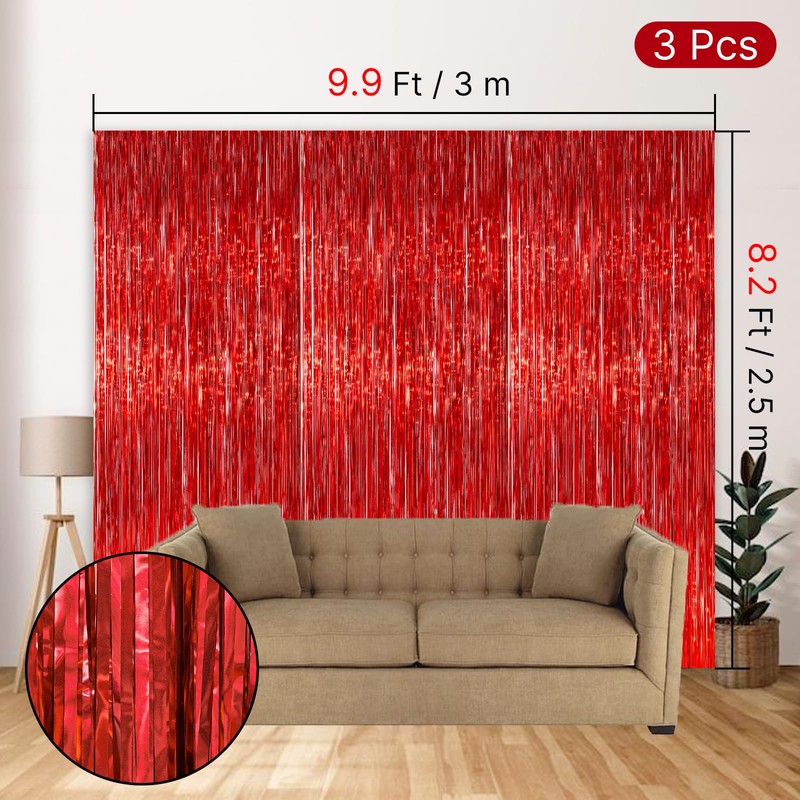 - Package Included:3 pcs red foil fringe curtains [8.2×3.3ft,total 27 sq ft]. Equipped with double-sided adhesive tape, these fade-resistant foil curtain backdrops can be easily cut and adjusted to fit various party decoration requirements