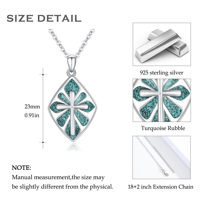 - Cross pendant size: 23 x 18 mm/0.91 x 0.71 inches, chain length: 18 + 2 inch extension chain with sterling silver. Packaging: 1 x sterling silver turquoise cross necklace; 1 x polishing cloth; 1 x exquisite gift box.