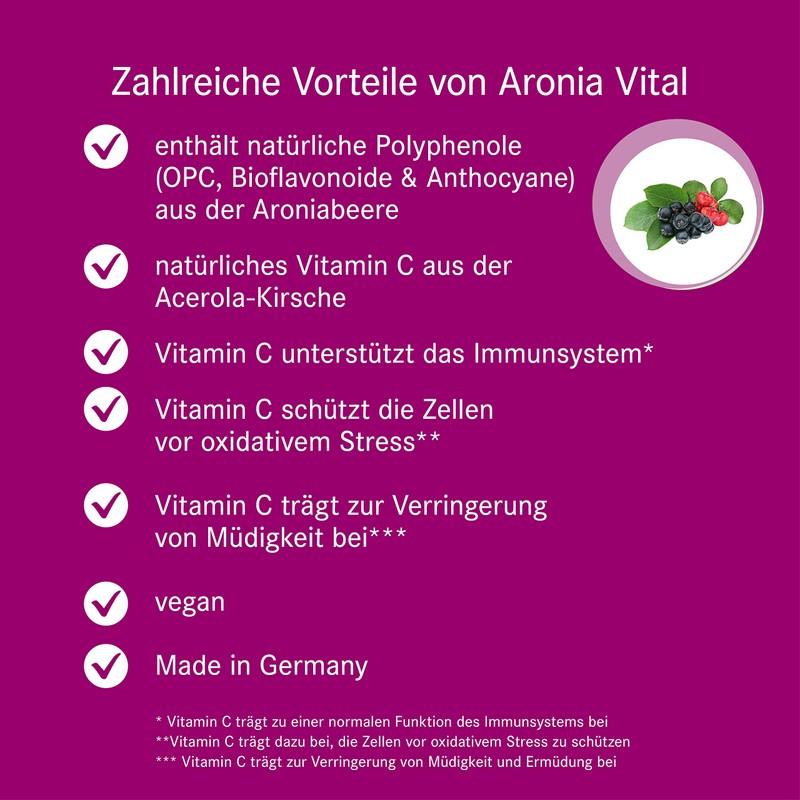 - Best ingredients: developed and made in Germany (with aronia berry extract from the EU and acerola extract from Brazil), trust in laboratory-tested quality