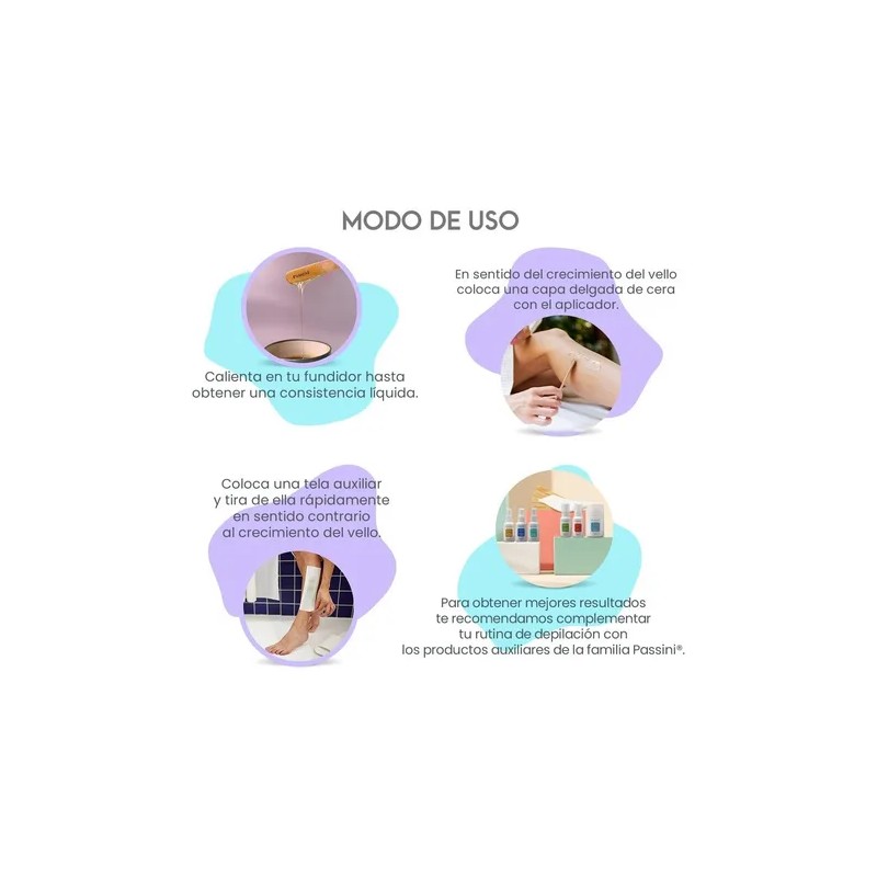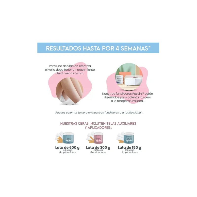 - Incluye una Cera depilatoria Waxy 150g o Cera depilatoria Passini 150g. ELEGIR AL MOMENTO DE REALIZAR TU COMPRA.