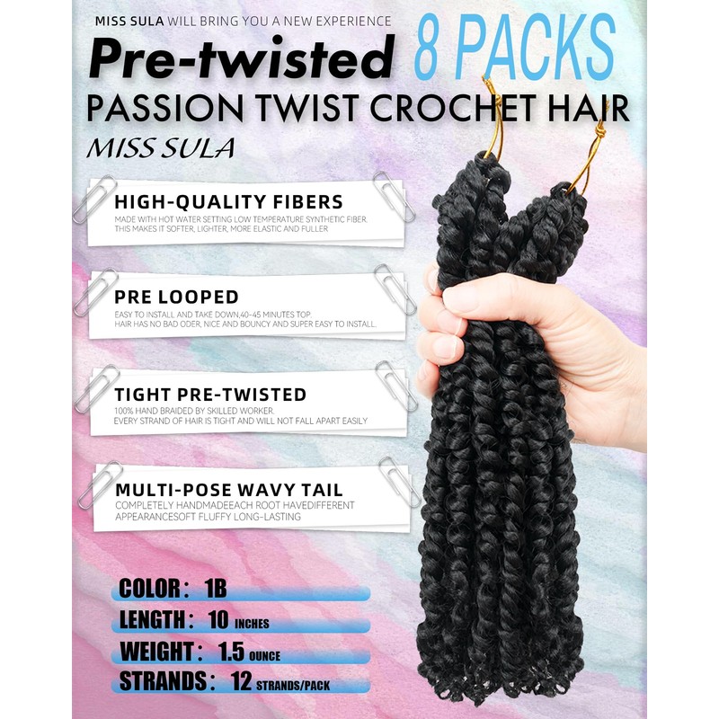 - Passion Twist Hair 10 inch Feature:Pre-looped,Easy to Install,Super Lightweight,Super Soft,Skin Friendly,No Smell,Tangle-Free,Long-lasting,High Resilience,Non-reflective, More Natural.