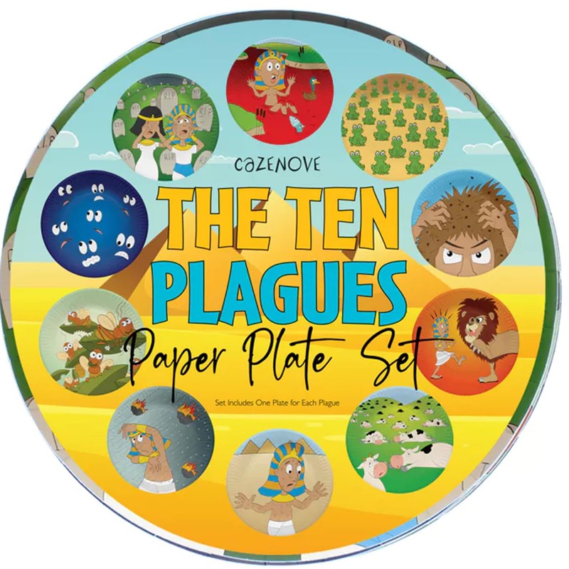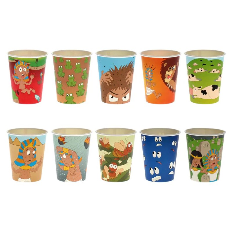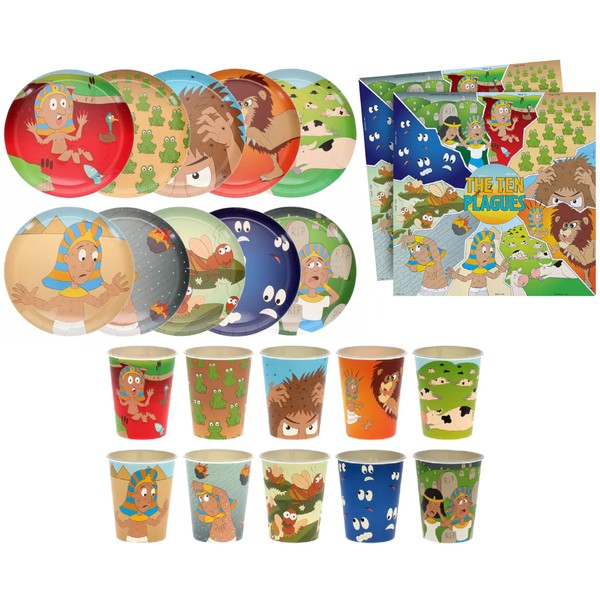 Full set of Matching design ten plagues Disposable goods for Passover, all you need to create the celebration mood! 20 settings - 20 9" plates, 20 cups and 20 napkins. 2 sets of 10 plates and cups each showing another of the ten plagues.
