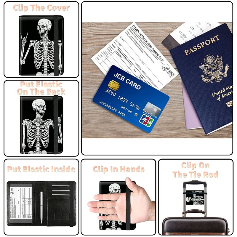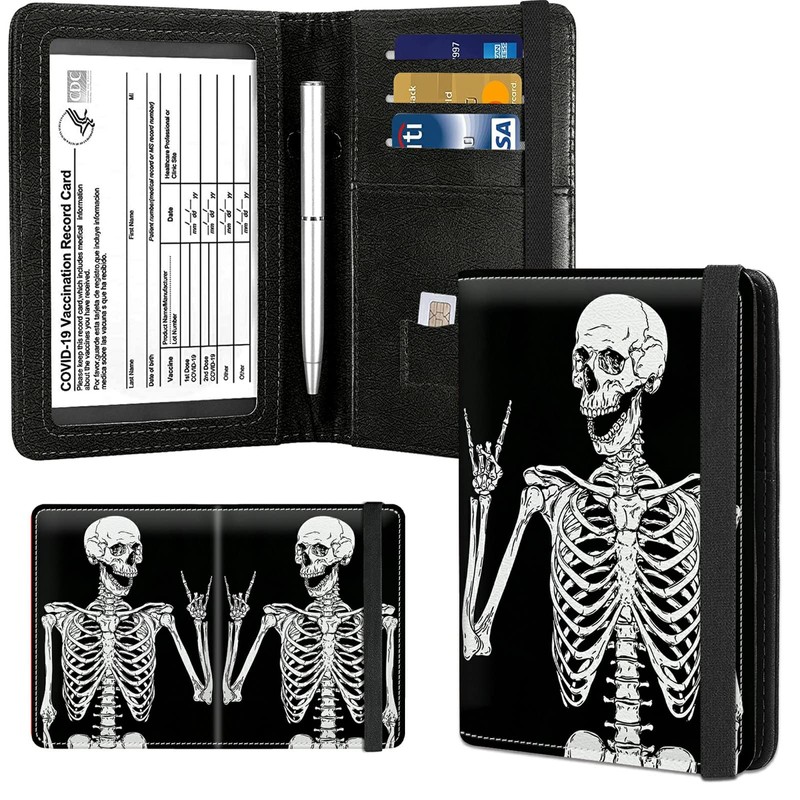 Passport Case and CDC Vaccine Card Holder Combo, Skull Skeleton Leather Wallet RFID Blocking Elastic Strap Passport Holder with Credit Card Slots, Travel Organizer Document Plus a Pen