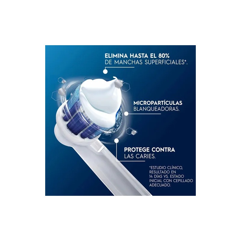 Descripción Limpia: Complemente tu rutina de cepillado con la Pasta de Dientes Oral-B 3D White Brilliant Fresh, que con micropartículas blanqueadoras patentadas, pule suavemente las manchas de la superficie. Esta Pasta Dental te ayuda a mantener una sonrisa más saludable. La Pasta Dental 3D White cuenta con espuma de acción que ayuda a limpiar zonas de difícil acceso, además, protege el esmalte y ayuda a prevenir la caries, remover la placa y refrescar el aliento. Usa la Pasta Dental con un cepillo de dientes manual o eléctrico Oral-B para obtener increíbles resultados.