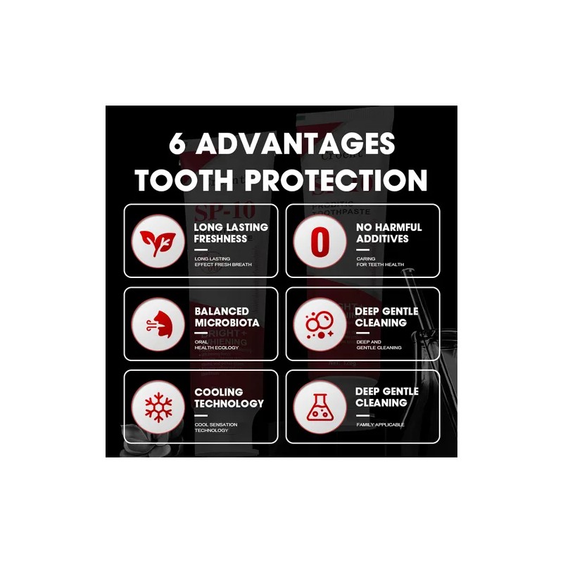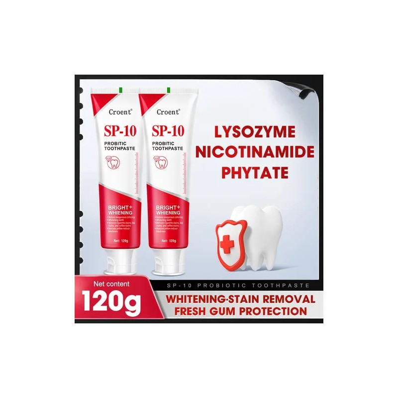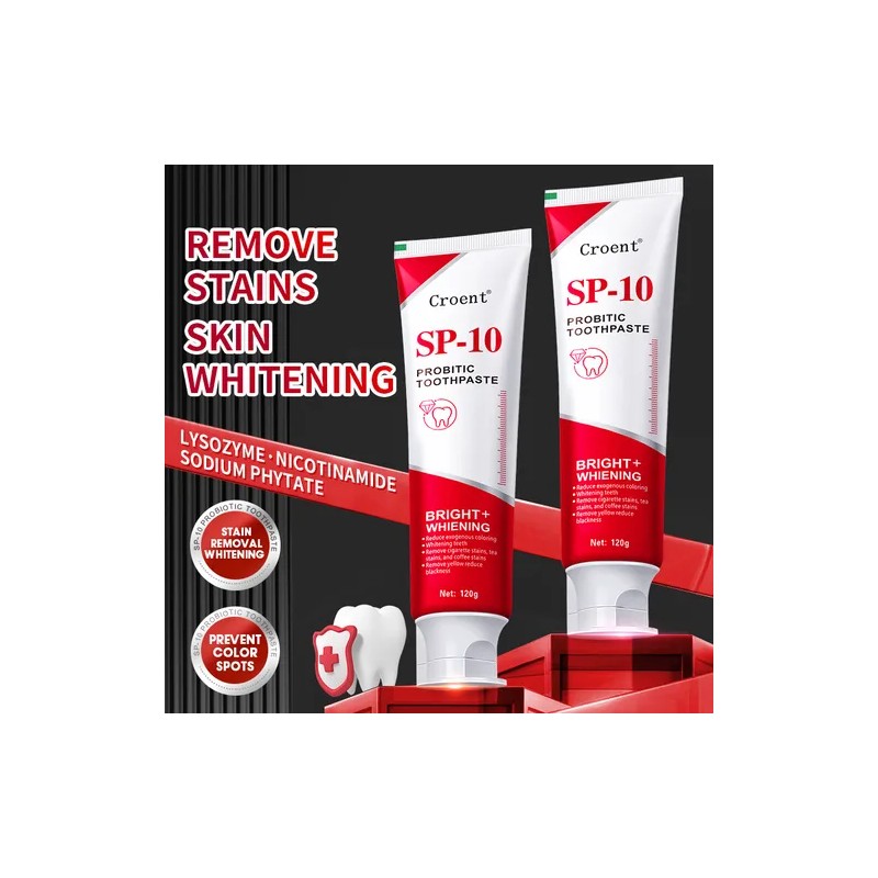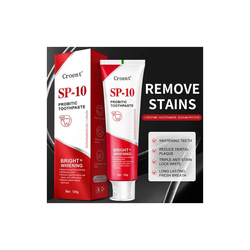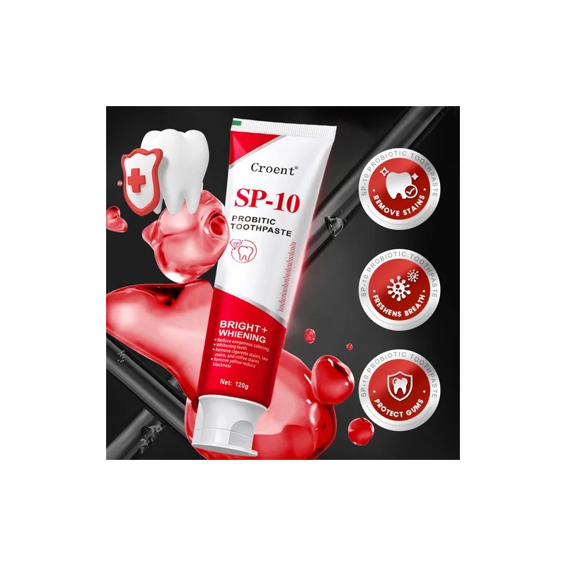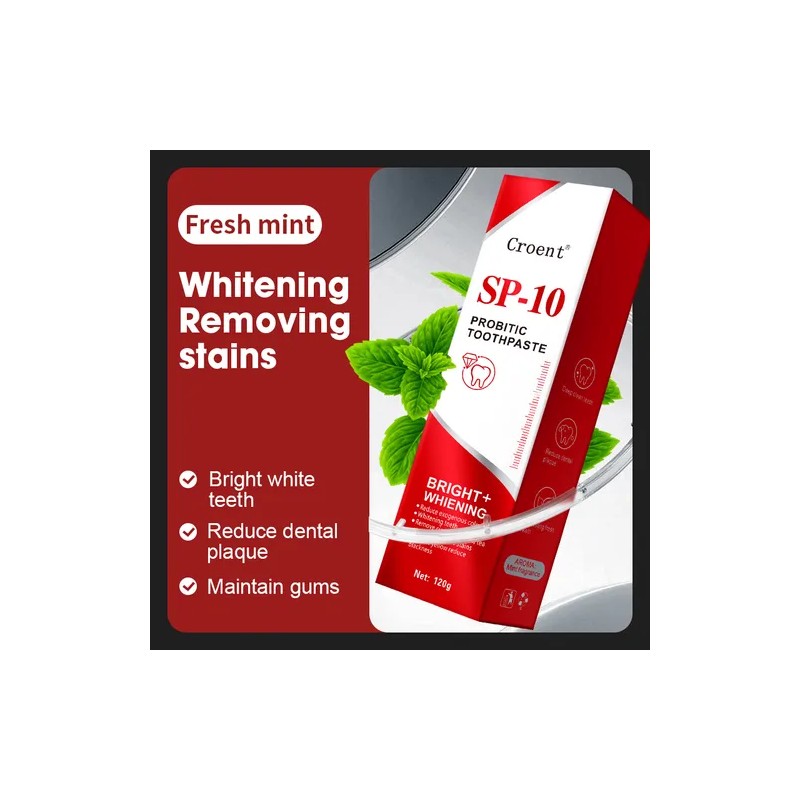 Descripción Limpia: La pasta dental Croent SP-10 combina tecnología probiótica y minerales activos para un blanqueamiento profesional. Su fórmula con partículas SP-10 elimina manchas de café/tabaco sin dañar el esmalte, mientras los probióticos equilibran la microbiota bucal y reducen la placa bacteriana. Enriquecida con extracto de menta alpina y calcio orgánico, brinda 12 horas de frescura intensa y refuerza el tejido gingival. Ideal para fumadores y amantes del café que buscan sonrisas clínicamente blancas con protección anticaries. ¡Resultados visibles desde la primera semana!