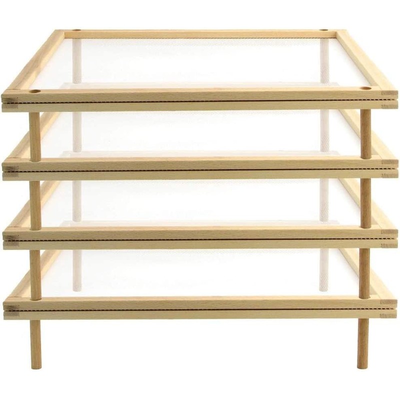 - Net made of food-safe-certified plastic with square mesh holes between 2 and 3 millimeters for efficient air flow and quick drying