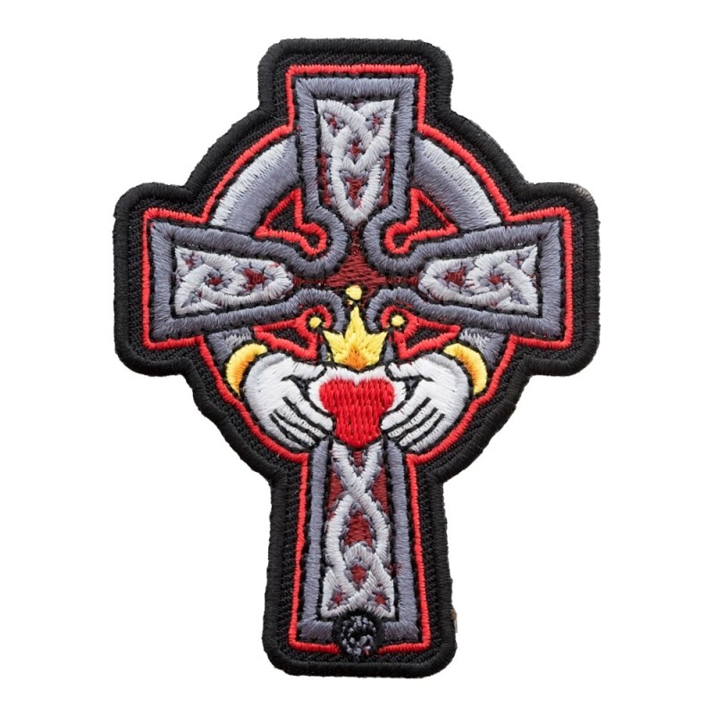 Embroidered gray, red, black, and yellow Celtic Claddagh cross, on a black twill cut-out patch with a black border