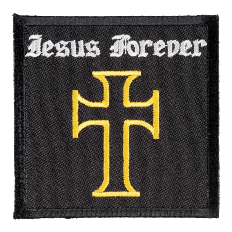 "JESUS FOREVER" embroidered in white on a black Christian biker patch with a golden cross.