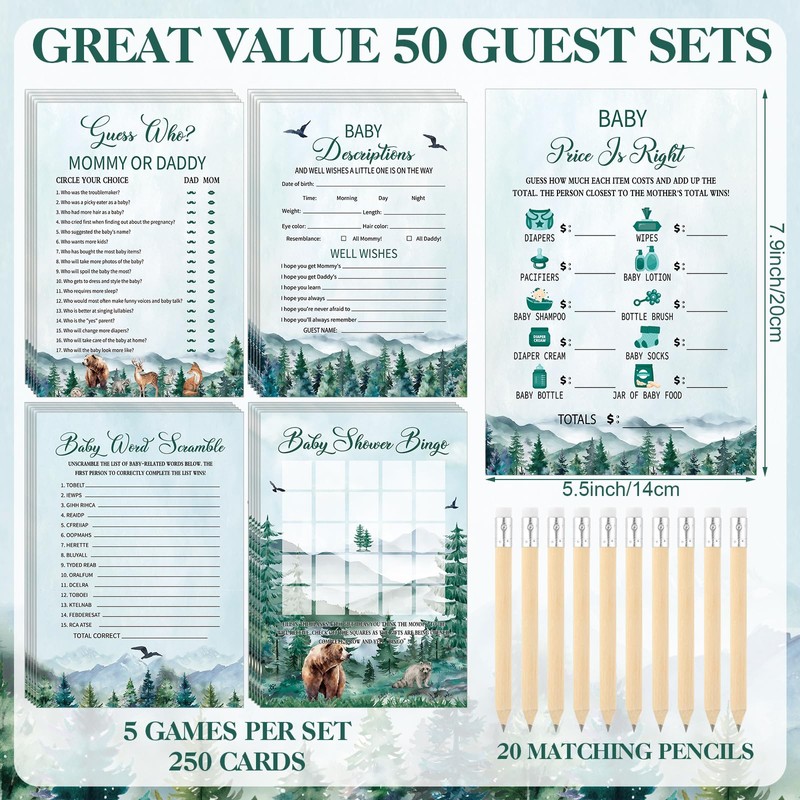 Patelai Let the Adventure Begin Baby Shower Games 321 Pcs Set 5 Games Include Baby Shower Bingo Price Is Right Guess Who Mommy or Daddy Word Scramble Prediction and Well Wishes with 20 Matching Pencil