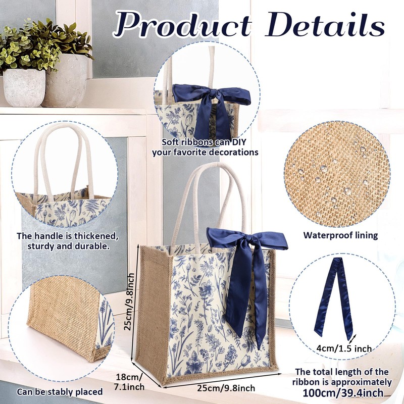 Paterr 3 Pack Wedding Burlap Tote Bags with Handles Reusable Jute Gift Bags with Silk Ribbon Blue Floral Jute Handbags Pack Set for Shopping Bridesmaid Wedding Bachelorette Party DIY