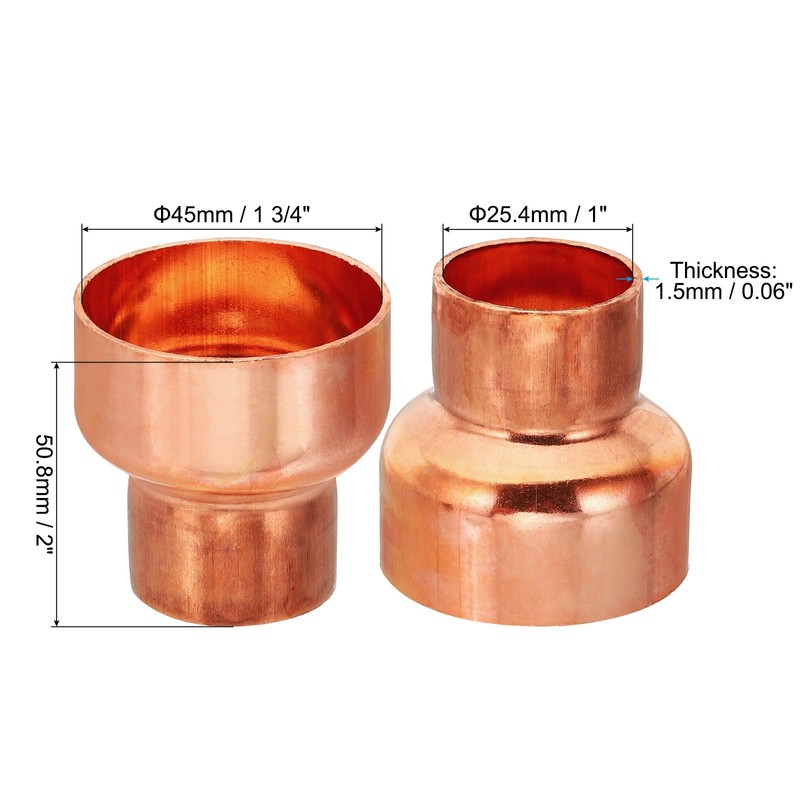 - Color: Copper Tone; Material: Copper; Type: Copper Reducer; Bigger End Inner Dia.:45mm / 1 3/4 inch; Smaller End Inner Dia.:25.4mm / 1 inch; Thickness.: 1.5mm / 0.06 inch; Total Length: 50mm / 1.97 inch; Packing List: 1 x Copper Reducer