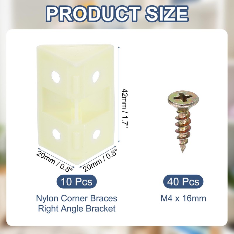 - Material: Plastic; Overall Size: 42 x 20 x 20 mm / 1.7 x 0.8 x 0.8 inch (L*H*W); Hole Diameter: 4 mm / 0.16 inch; Hole Distance: 14.5 mm / 0.57 inch; Cover Size: 38 x 21 mm / 1.4 x 0.8 inch (L*W); Screw Size: M4 x 16mm; Packing List: 10Pcs x Nylon Corner Braces Right Angle Bracket, 2Pcs x Screws
