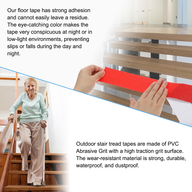 - Features: Outdoor stair tread tapes are made of PVC Abrasive Grit with a high traction grit surface that prevents edges from curling, wrinkling, or tearing. The wear-resistant surface does not easily fade, it has strong durability and is waterproof and dustproof.