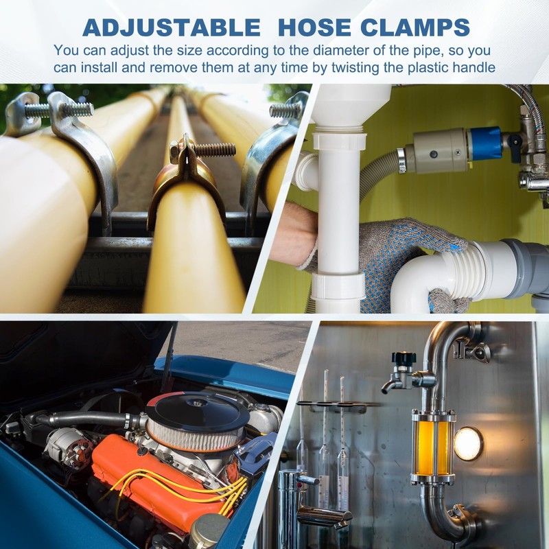 Adjustable Design: All the hose clamps with adjustable screws, you can adjust the size according to the diameter of the pipe, so you can install and remove them at any time with a socket wrench. The adjustable range of the clamp shows the minimum and maximum hose diameters it fits.