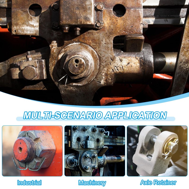 Single-hole flat head pins are suitable for small home DIY projects, home repairs, and furniture installation, such as hooks, latches, etc.; they are also great for multi-purpose trailers, industries, machinery manufacturing, hinges, or shaft fixing devices applications that require safety pin clips, etc.
