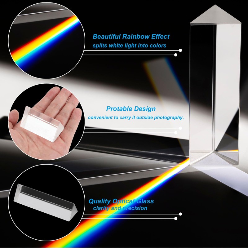 - Advantage: 1. The high-quality optical glass provides superior clarity and precision, is durable and practical to use. Besides, it is compact and convenient for you to carry it outside of photography. 2. Triangular shape design that reflects light, splits white light into colours and produces a beautiful rainbow effect.