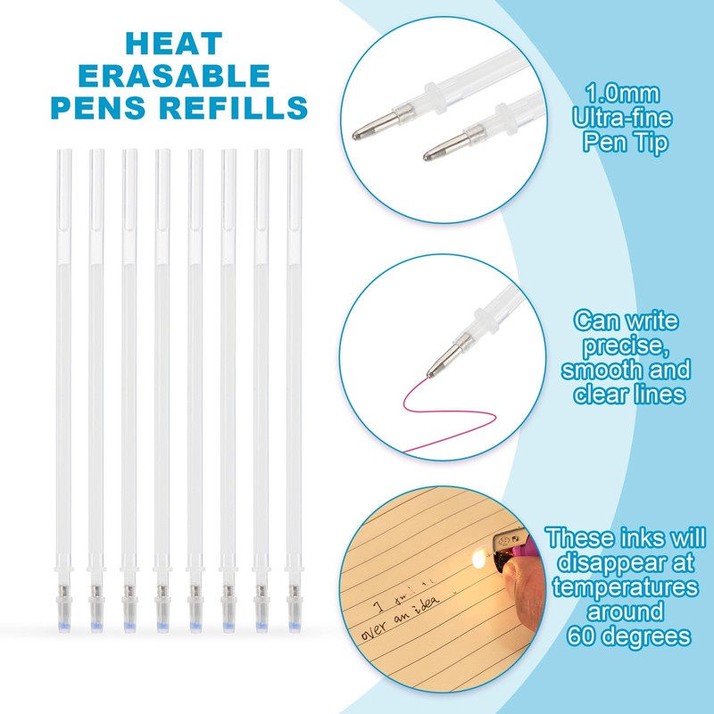 - Advantage: 1. Our heat-erasable gel pen refills use a unique gel ink that is clear in color and will disappear with erasing friction. These inks are erasable at temperatures around 60 degrees, and when you quickly touch the iron, you will see the markings disappear without any residue. 2. With a medium 1.0mm point, our erasable gel pen provides smooth and consistent ink flow for an exceptional writing experience. The markings of the fabric marking pen are visible, and not easy to confuse