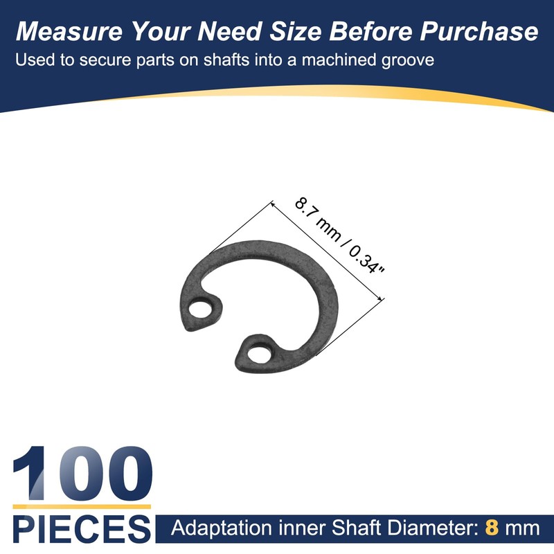 - Adaptation inner Shaft Diameter: 8 mm / 0.31 inch; Outer Ring Dia: 8.7 mm / 0.34 inch; Packing List: 100 Pcs x C Clip Circlip Rings (NOTE: Please measure the size of your need before purchasing)