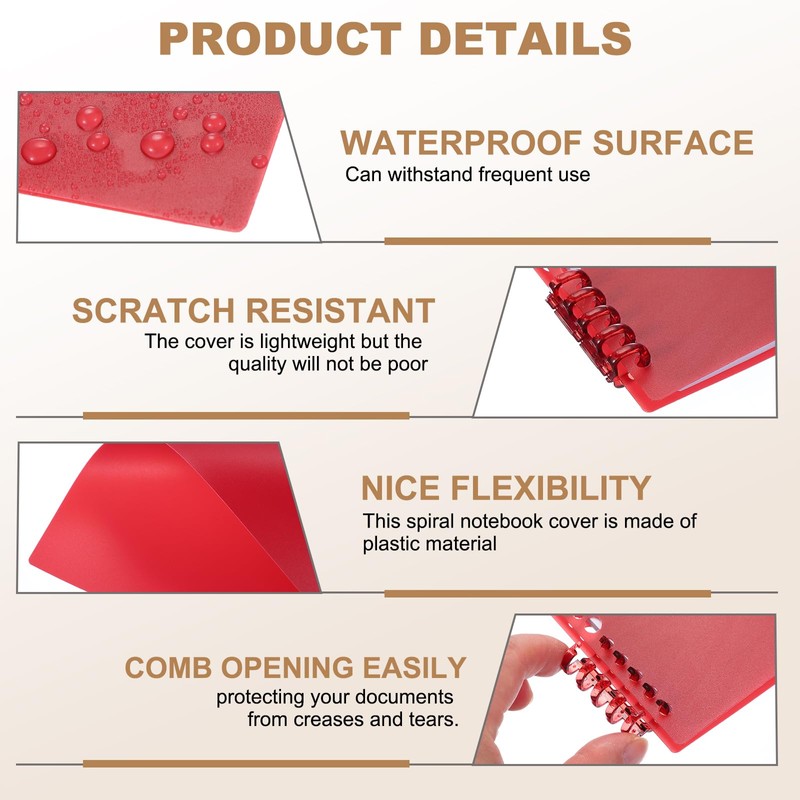 - Color: Pink; Material: Plastic; Cover Thickness: 22 Mil; Holes: 26; Size: 10.3x7.2 inch / 26.3x18.3 cm (LxW); Packing List: 2pcs of Spiral Notebook Cover x 6, Binding Comb x 2