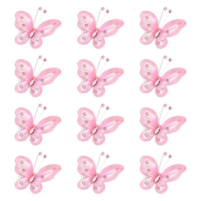 - Material: Mesh fabric, acrylic gem and metal wire; Color: Light Pink; Size: 55 x 55mm / 2.17 x 2.17inch; Packing List: 12 pcs butterflies for crafts